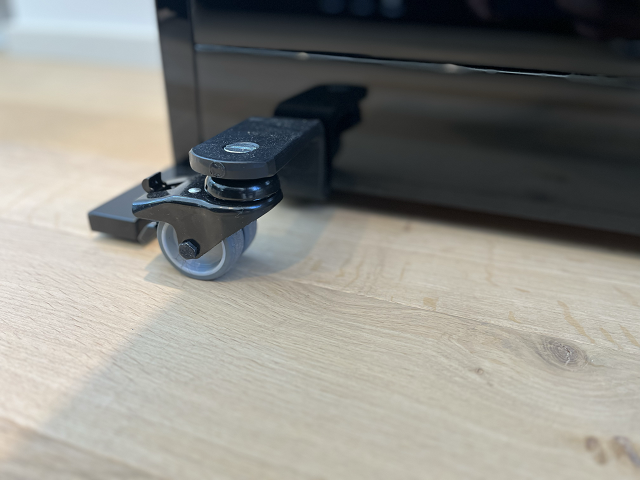 Die Schulausstattung, bestehend aus 2 Rollenböcken, auf denen das Instrument steht und der matten Folierung ermöglicht, dass Klavier sehr einfach zu verschieben. Da die Schulaussattung das Design des Instruments stark beeinflusst, ist es möglich, diese abzumontieren.