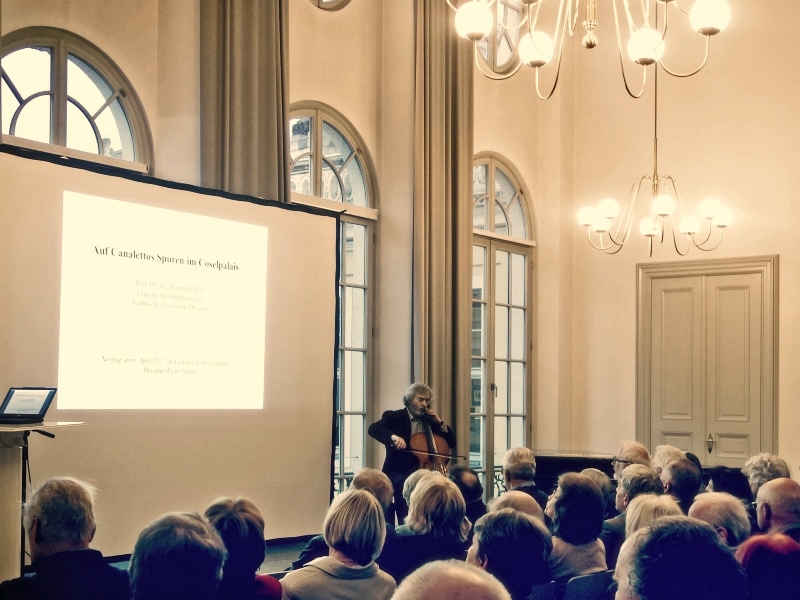 Die Vortragsveranstaltung im Festsaal des Coselpalais stand ganz im Zeichen der Baugeschichte des Palais und seines wohl berühmtesten Bewohners, des venezianischen Vedutenmalers Bernardo Bellotto, genannt Canaletto.