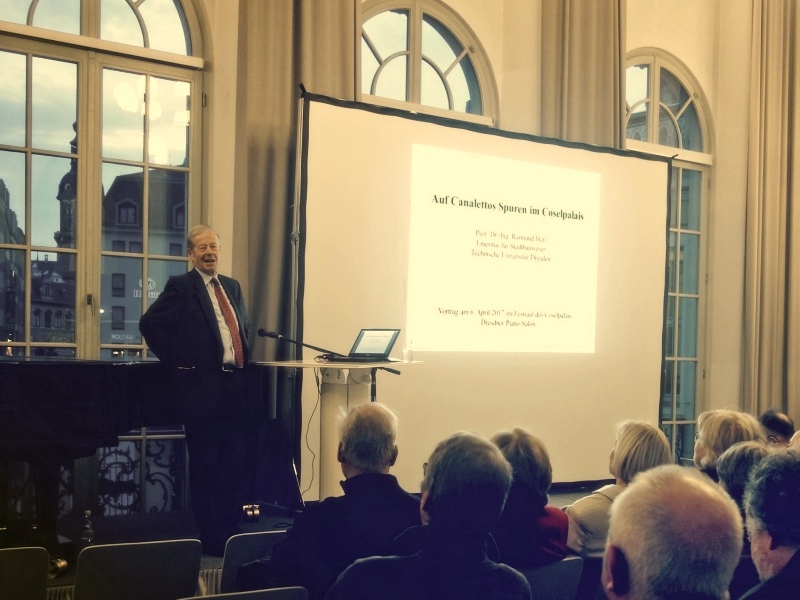 Zunächst gab der ehemalige Landeskonservator Prof. Dr. Gerhard Glaser eine Einführung „Zur Wiedergewinnung eines historischen Ortes“ nach der Totalzerstörung des Coselpalais im Februar 1945. Dann präsentierte der Emeritus für Stadtbauwesen Prof. Dr.-Ing. Raimund Herz die jüngsten Ergebnisse seiner bauhistorischen Nachforschungen über Canalettos Wohn- und Arbeitsetage, die dieser im Juni 1747 bezog und, mit einer dreijährigen Unterbrechung während des Siebenjährigen Krieges, bis Ende 1766 bewohnte.
