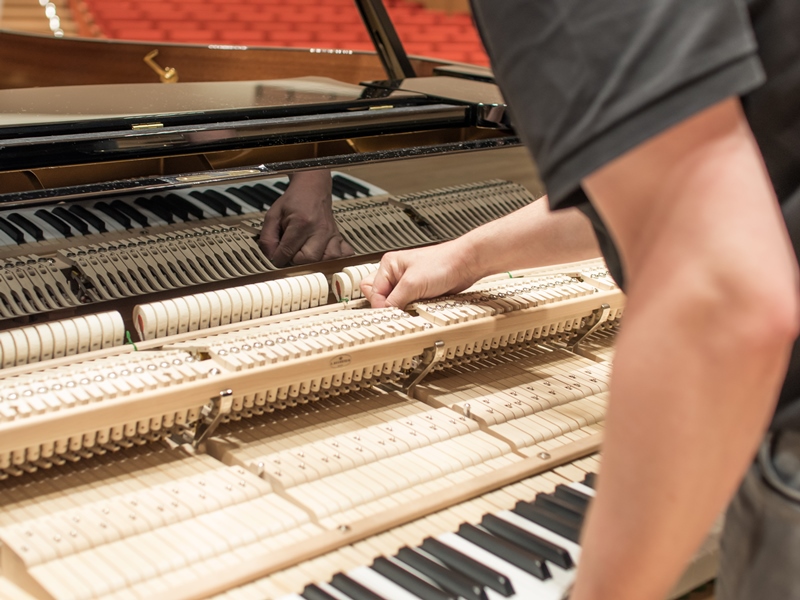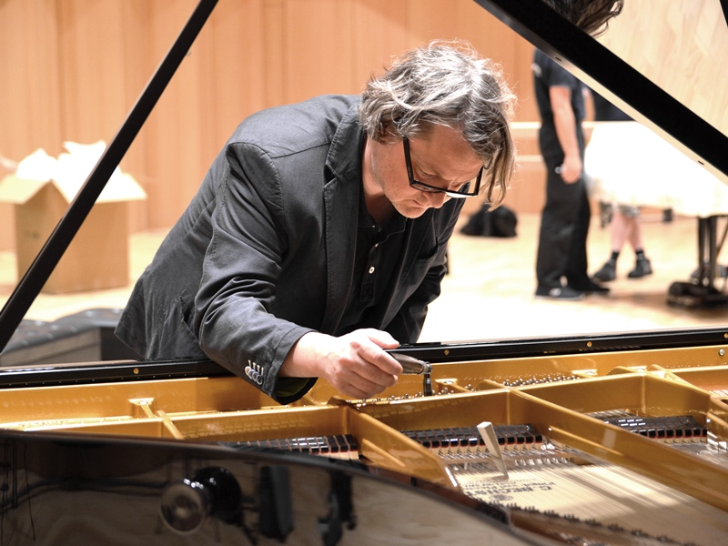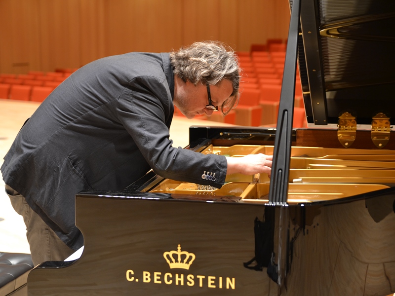 Der Aufbau der drei Konzertflügel auf der Bühne verläuft zügig, professionell und reibungslos. Anschließend besteht für C. Bechstein Konzerttechniker Torben Garlin die Aufgabe, innerhalb von etwa einer halben Stunde alle drei Flügel nach dem Transport zu überprüfen und die letzten klanglichen und spieltechnischen Feineinstellungen vorzunehmen. Das meistert der erfahrene Klavierbauer und Konzerttechniker mit Bravour.
