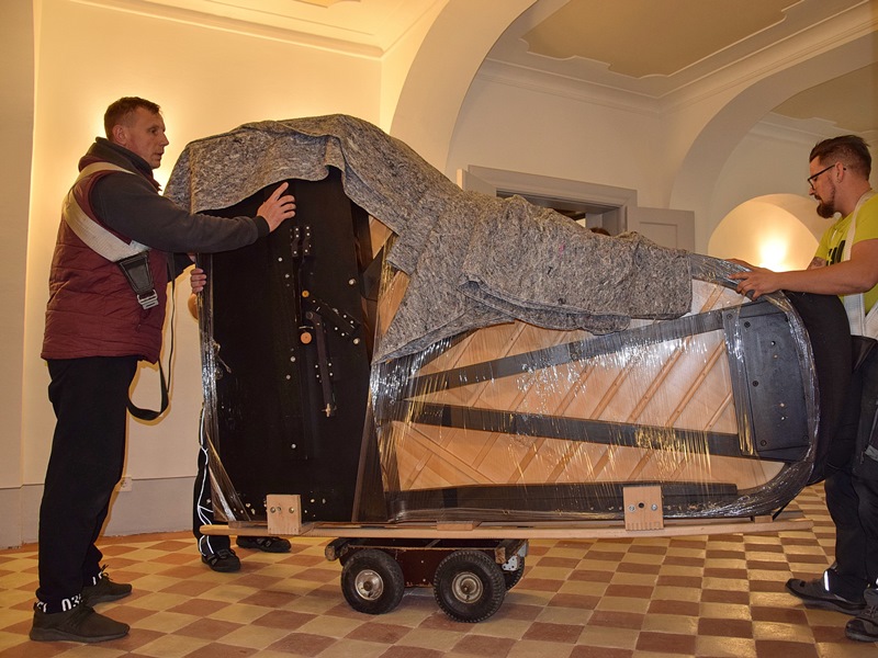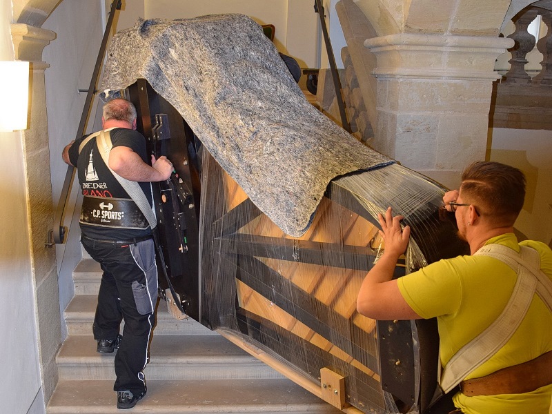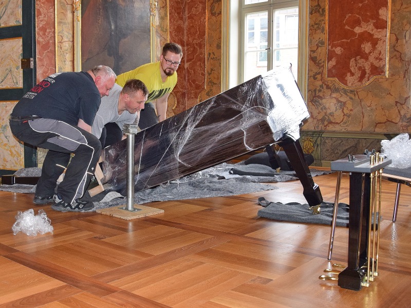 Für die Lieferung des Semi-Konzertflügels von Dresden nach Eisenach zeigte sich der Transportleiter des C. Bechstein Centrums Dresden im DRESDNER PIANO SALON, Torsten Hähne, verantwortlich. Bereits am 26. März lieferte er den Bechstein-Flügel zusammen mit seinem Team in Eisenach im Stadtschloss an. Mit großen Gurten trugen die Transporteure das etwa 420 kg schwere Instrument über die Stufen im historischen Treppenhaus des Schlosses hinauf in die erste Etage. In den Rokokosaal gelangte der Flügel dann auf einem Rollwagen, wo er ausgepackt und aufgestellt wurde. Den finalen Standort erhielt der Flügel mit Unterstützung von Kulturamtsleiter Dr. Achim Heidenreich, der das Team um Torsten Hähne mit dem Flügel an die Stelle dirigierte, an der sich die beste Raumakustik erzielen lässt.