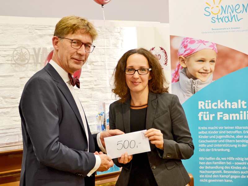 Dresden – 28. September 2019. Am heutigen Abend konnte Bert Kirsten der Geschäftsführerin des Sonnenstrahl e.V. Dresden, Antje Herrmann, den Erlös aus der Tombola anlässlich des 30-jährigen Firmenjubiläums übergeben. Der Losverkauf, bei dem als erster Preis ein Klavier im Wert von 3.995,- € zu gewinnen war, brachte trotz der kurze Laufzeit von etwa 5 Wochen einen Betrag von 500,- € ein.