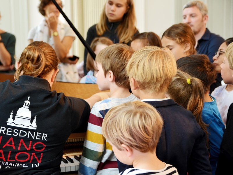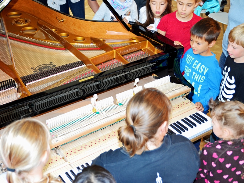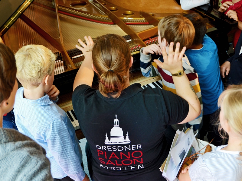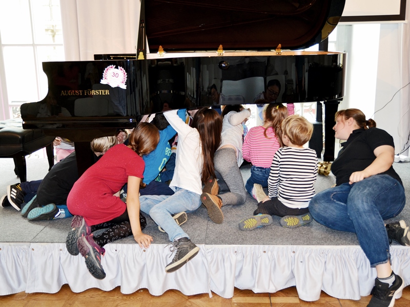 Am gestrigen Samstagmorgen gingen musikbegeisterte Kinder gemeinsam mit Klavierbauerin Anna Baldauf der Frage nach, wo eigentlich genau der Ton in einem Flügel versteckt ist. Dabei öffneten sie Hüllen, Abdeckungen, Deckel und Klappen am großen Konzertfügel im Robert-Schumann-Saal, um hinter die Kulissen des Instruments zu schauen.