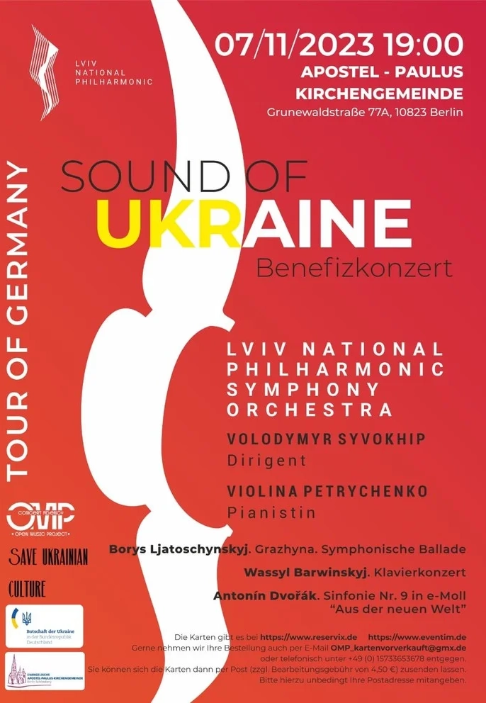 Den Titel „Sound of Ukraine” trägt ein Benefizkonzert, welches das Lviv National Philharmonic Symphony Orchestra unter dem Dirigenten Volodymyr Syvohyp am Dienstag, 7. November 2023, um 19 Uhr in die Apostel-Paulus Kirchengemeinde in Berlin-Schöneberg führt. Die Pianistin Violina Petrychenko wird auf einem C. Bechstein Konzertflügel D 282 das Klavierkonzert von Vasyl Barvinsky spielen. Weiterhin stehen Ljatoshynskyjs Symphonische Ballade “Grazhyna” sowie Dvoraks neunte Sinfonie „Aus der Neuen Welt“ auf dem Programm.