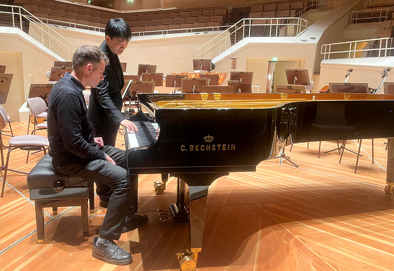 Der Dirigent wirkte in der Probe ein bisschen wie ein Besessener, der bis zur letzten Minute der Anspielprobe mit seinen Musikerinnen und Musikern an Details arbeitet, beispielsweise der Länge des Portato in einer Passage oder die Gestaltung eines Accelerando in einer anderen. Mit dem Pianisten ist solch eine Detailarbeit kaum notwendig. Denn Kit Armstrong kennt „natürlich“ die kompletten Partituren der Werke auswendig, spielt oft den Orchesterpart kaum hörbar mit, versteht sich mit dem Dirigenten bestens und musiziert mit diesem wie mit dem Orchester in einer Intensität, als spielten sie Kammermusik! Immer wieder suchen und finden sich in diesem Konzert die Blicke.