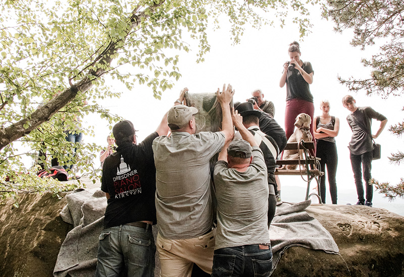Mit vereinten Kräften hievte das Team des C. Bechstein Centrums Dresden rund um Klavierbaumeister Bert Kirsten einen C. Bechstein Flügel auf die Ochel bei Hohnstein. Mehr als 400 Kilogramm wog das wunderbare Instrument, das zur Freude der Wanderer in der Sächsischen Schweiz dann von Dirk Ebersbach von der Dresdner Tastenschule und seinen jungen Musikern gespielt wurde. Ein ganz besonderes Konzert vor der traumhaften Kulisse des Elbsandsteingebirges!
