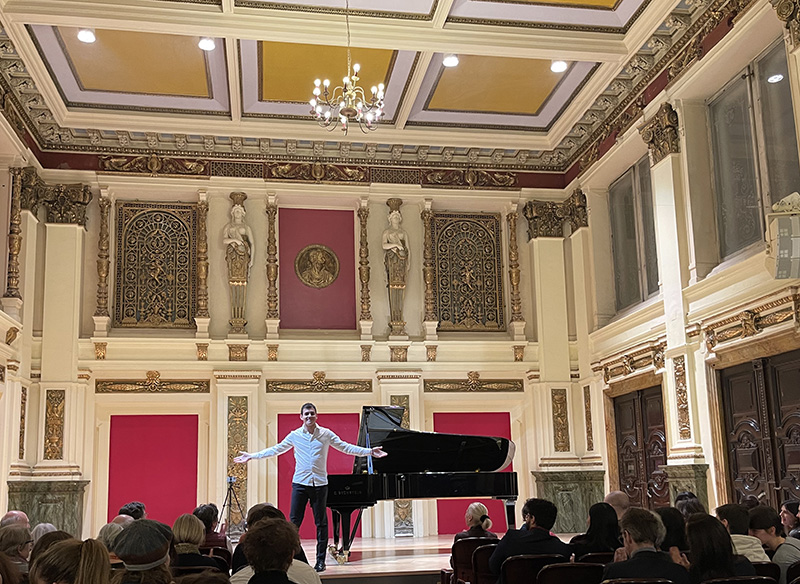 The new spotlights in the newly renovated Ehrbar Hall outshined alongside the audience, for Aaron Pilsan was able to captivate the visitors from the beginning. Surprisingly he started with Schumann’s melancholic-cantabile Arabesque. He added this piece extra to the programme, because it was composed in Vienna in 1839. He then gave an unyielding character of Schumann’s “Carneval”, in which the mood swings between Eusebius and Florestan were outstandingly conveyed. In Grünfeld’s brisk concert paraphrase “Sourée di Vienne” and Liszt’s highly virtuose Rigoletto-Paraphrase, Pilsan demonstrated how beautifully he can bring out the middle voices, how finely he can differentiates the sounds, and how rousingly he can build up the musical tensions.