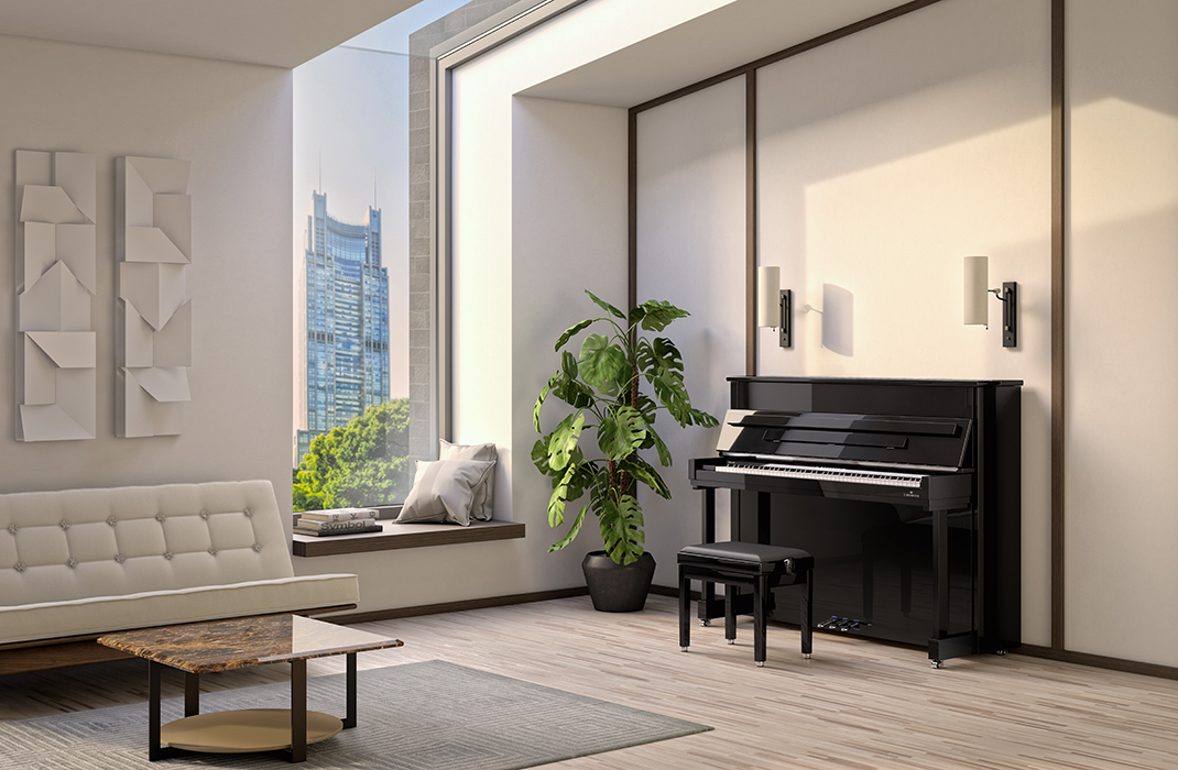 C. Bechstein Elegance 124: flowing lines and elaborate details come together to form an elegant silhouette that beautifully complements any living room