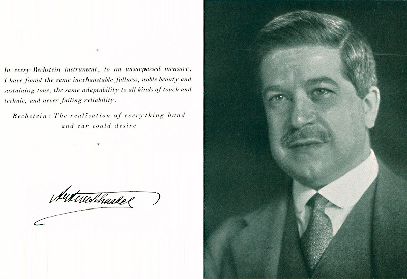 Artur Schnabel preferred Bechstein grand pianos and explained this as follows: "On all Bechstein instruments I have found the same inexhaustible fullness, noble beauty and singing capacity of the tone, the same adaptability to every type of attack and technique, the same never-failing reliability in unsurpassed measure combined. Bechstein gratifies both hand and ear."