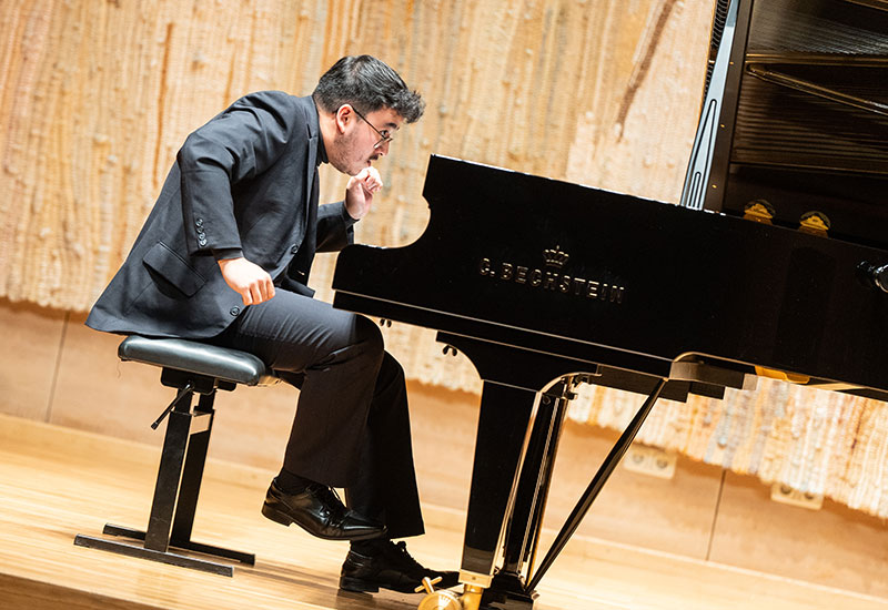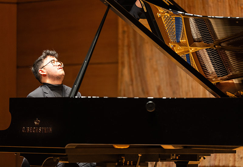 Born in 2000 to Bolivian-Chinese parents in the United Kingdom, the concert pianist embarked on his formative years at the Royal College of Music Junior Department in London under Nataša Lipovšek, where he made his debut solo recital at the Royal Albert Hall’s Elgar Room and two festival appearances at the Wigmore Hall. At 15 he received 1st prize at the Beethoven Piano Society of Europe’s Junior Intercollegiate Piano Competition, where his performance at the national-level competition was described as having “maturity and polish that belied his years” (Malcolm Miller 2016).